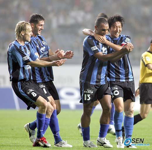 11일 인천 문학 월드컵경기장에서 열린 인천 유나이티드와 부산 아이파크의 경기 후반 막판 인천의 셀미르(오른쪽에서 두 번째)가 오버헤드킥으로 동점골을 넣은 뒤 임중용의 축하를 받으며 '아기 어르기' 골 세리머니를 시작하고 있다./인천=손용호 기자 spjj@osen.co.kr [Copyright ⓒ OSEN(www.osen.co.kr) 무단전재 및 재배포 금지]