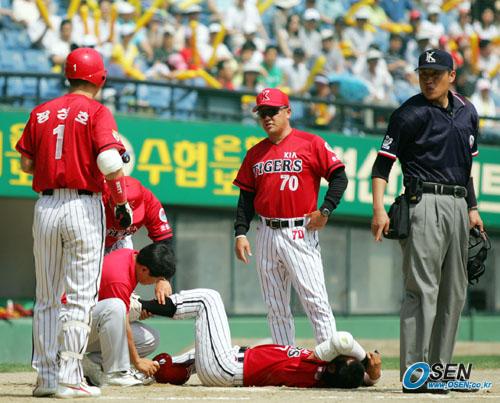 12일 두산 베어스와 기아 타이거즈의 잠실경기 기아의 3회초 2사 2루서 이종범이 두산 선발 투수 이혜천의 투구에 발목을 맞은 뒤 그라운드에 누운 채 응급처치를 받고 있다./잠실=주지영 기자 jj0jj0@osen.co.kr [Copyright ⓒ OSEN(www.osen.co.kr) 무단전재 및 재배포 금지]