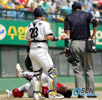 12일 두산 베어스와 기아 타이거즈의 잠실경기 기아의 3회초 2사 2루서 이종범이 두산 선발 투수 이혜천의 투구에 발목을 맞고 쓰러지 괴로워하고 있다./잠실=주지영 기자 jj0jj0@osen.co.kr [Copyright ⓒ OSEN(www.osen.co.kr) 무단전재 및 재배포 금지]