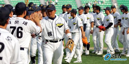 12일 기아 타이거즈의 잠실경기서 4-1로 이겨 전날의 패배를 설욕한 두산 선수들이 경기 후 승리를 자축하고 있다./잠실=주지영 기자 jj0jj0@osen.co.kr [Copyright ⓒ OSEN(www.osen.co.kr) 무단전재 및 재배포 금지]
