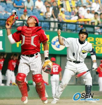 12일 두산베어스와 기아 타이거즈의 잠실경기 두산의 8회말 1사 1,2루 나주환의 타석에서 기아 투수 차정민의 폭투가 나오자 나주환과 기아 포수 김상훈이 공의 행방을 쫓고 있다. 이 사이 주자들은 한 베이스씩 진루했다./잠실=주지영 기자 jj0jj0@osen.co.kr [Copyright ⓒ OSEN(www.osen.co.kr) 무단전재 및 재배포 금지]
