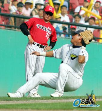 12일 두산 베어스와 기아 타이거즈의 잠실경기서 1-1 동점이던 기아의 8회초 무사 2루서 마해영의 빗맞은 파울 플라이를 두산 3루수 김동주가 주저 앉으면서 잡아내 한 고비를 넘기고 있다./잠실=주지영 기자 jj0jj0@osen.co.kr [Copyright ⓒ OSEN(www.osen.co.kr) 무단전재 및 재배포 금지]