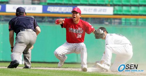 12일 두산 베어스와 기아 타이거즈의 잠실경기 두산의 7회말 1사 1루서 용덕한 타석 때 2루 도루를 시도한 윤승균이 세이프로 판정받자 기아 유격수 홍세완이 심판을 쳐다보며 아쉬워 하고 있다./잠실=주지영 기자 jj0jj0@osen.co.kr [Copyright ⓒ OSEN(www.osen.co.kr) 무단전재 및 재배포 금지]