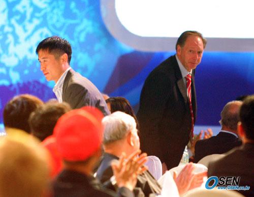 '2005 MBC 세계 유소년 축구대회'의 조추첨을 겸한 전야제가 13일 저녁 홍은동 그랜드 호텔에서 열렸다. 본프레레 감독과 이영표 선수가 정몽준 회장의 소개로 많은 사람들에게 자리에서 일어나며 인사를 하고있다./주지영 기자 jj0jj0@osen.co.kr [Copyright ⓒ OSEN(www.osen.co.kr) 무단전재 및 재배포 금지]