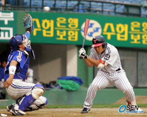 15일 삼성 라이온즈와 LG 트윈스의 잠실경기 2회말 2사 1,2루서 LG의 정의윤이 몸쪽 공에 놀라며 몸을 움츠리고 있다. 정의윤은 이어 중전 안타로 1타점을 올렸다./잠실=주지영 기자 jj0jj0@osen.co.kr [Copyright ⓒ OSEN(www.osen.co.kr) 무단전재 및 재배포 금지]