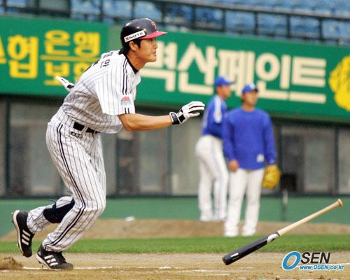 15일 삼성 라이온즈와 LG 트윈스의 잠실경기 3회말 LG의 선두 타자 안재만이 130m짜리 대형 중월 솔로홈런을 날린 뒤 여유있게 타구를 지켜보고 있다./잠실=주지영 기자 jj0jj0@osen.co.kr [Copyright ⓒ OSEN(www.osen.co.kr) 무단전재 및 재배포 금지]