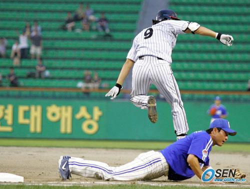16일 삼성 라이온즈와 LG 트윈스의 잠실경기 2회말 2사 2루서 LG 이병규가 2루수 땅볼을 친 뒤 송구가 1루 뒤쪽 파울 지역으로 쏠리며 빠지자 다이빙 캐치를 시도한 삼성 1루수 김한수를 뛰어 넘으며 볼의 위치를 확인하고 있다. 이 사이 2루 주자가 홈인, LG가 2-0으로 앞섰다./잠실=주지영 기자 jj0jj0@osen.co.kr [Copyright ⓒ OSEN(www.osen.co.kr) 무단전재 및 재배포 금지]