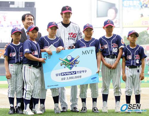 15일 삼성 라이온즈와 LG 트윈스의 잠실경기에 앞서 LG의 박용택이 한국야구위원회(KBO)가 선정한 5월 타자 부문 MVP상을 수상한 뒤 모교인 고명 초등학교 야구부 후배들에게 상금의 절반인 150만원을 장학금으로 주고 기념 촬영하고 있다. /잠실=주지영 기자 jj0jj0@osen.co.kr [Copyright ⓒ OSEN(www.osen.co.kr) 무단전재 및 재배포 금지]