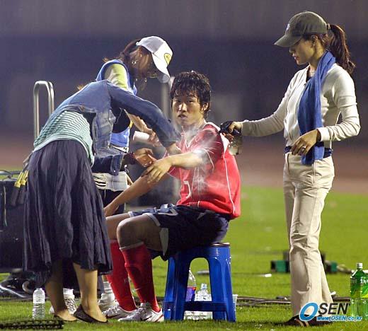 잉글랜드 프리미어리그 맨체스터 유나이티드 이적이 임박한 것으로 알려진 박지성(PSV 아인트호벤)이 16일 저녁 부천 공설운동장에서 게토레이 CF를 촬영했다. 현장감을 살리기 위해 스태프가 박지성의 옷에 스프레이로 물을 뿌리고 있다./부천=손용호 기자 osen.co.kr [Copyright ⓒ OSEN(www.osen.co.kr) 무단전재 및 재배포 금지]