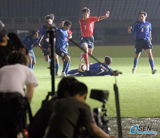 잉글랜드 프리미어리그 맨체스터 유나이티드 이적이 임박한 것으로 알려진 박지성(PSV 아인트호벤)이 16일 저녁 부천 공설운동장에서 게토레이 CF를 촬영했다. 박지성이 대표팀 유니폼과 같은 디자인의 복장으로 실전을 방불케 하는 장면을 찍고 있다./부천=손용호 기자 osen.co.kr [Copyright ⓒ OSEN(www.osen.co.kr) 무단전재 및 재배포 금지]