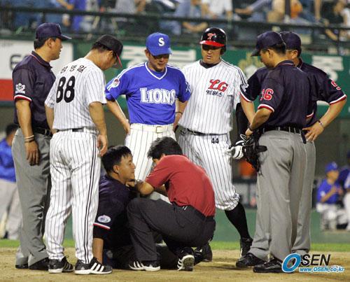 15일 삼성 라이온즈와 LG 트윈스의 잠실경기 9회말 2사 후 LG 이성렬의 대타로 나온 조인성의 파울 타구에 최수원 구심이 목을 맞고 주저앉아 있다. /잠실=주지영 기자 jj0jj0@osen.co.kr [Copyright ⓒ OSEN(www.osen.co.kr) 무단전재 및 재배포 금지]