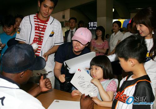 18일 두산 베어스와 한화 이글스의 잠실경기에 앞서 두산의 강봉규 랜들 임재철 스미스의 팬 사인회가 열렸다. 스미스에게 사인받은 팬이 '파이팅'을 외치자 스미스가 엄지 손가락을 들어보이고 있다./잠실=주지영 기자 jj0jj0@osen.co.kr [Copyright ⓒ OSEN(www.osen.co.kr) 무단전재 및 재배포 금지]
