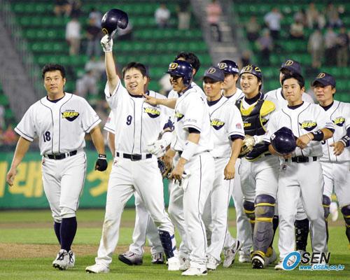 18일 두산 베어스와 한화 이글스의 잠실경기서 두산이 9회말 2사 2루서 나온 나주환의 끝내기 안타로 1-0으로 짜릿한 승리르 거뒀다. 승리의 주역 나주환(왼쪽에서 두 번째)이 동료들 틈에서 헬멧을 벗어 팬들에게 인사하고 있다./잠실=주지영 기자 jj0jj0@osen.co.kr [Copyright ⓒ OSEN(www.osen.co.kr) 무단전재 및 재배포 금지]