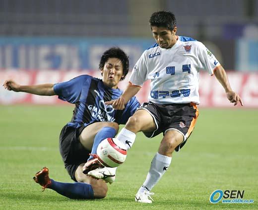 18일 인천 문학 월드컵경기장에서 열린 인천 유나이티드와 대구 FC의 경기 후반 인천 수비수 장우창이 대구 산드로의 드리블을 태클로 걷어 내고 있다. 인천은 마니치의 골로 앞서 나가다 산드로에게 동점골을 허용, 1-1로 비겼다./인천=손용호 기자 spjj@osen.co.kr [Copyright ⓒ OSEN(www.osen.co.kr) 무단전재 및 재배포 금지]