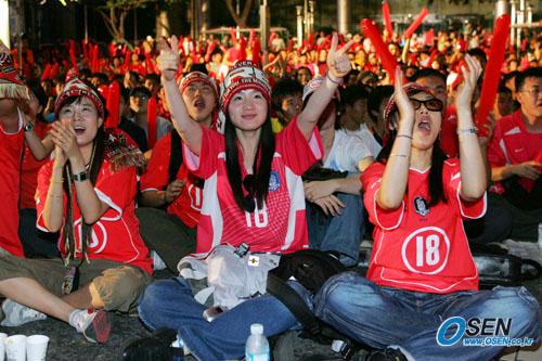 한국과 브라질의 2005세계청소년축구선수권대회 F조 조별리그 최종전을 응원하기 위해 광화문 네거리에 모인 붉은 악마가 대한민국을 외치며 16강 진출을 염원하는 응원을 하고 있다./광화문=주지영기자jj0jj0@osen.co.kr [Copyright ⓒ OSEN(www.osen.co.kr) 무단전재 및 재배포 금지]