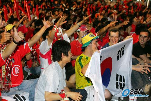 한국과 브라질의 2005세계청소년축구선수권대회 F조 조별리그 최종전을 응원하기 위해 광화문 네거리에 모인 붉은 악마에 브라질 응원단이 합세해 태극기를 흔들며 함께 응원을 하고있다./광화문=주지영기자jj0jj0@osen.co.kr [Copyright ⓒ OSEN(www.osen.co.kr) 무단전재 및 재배포 금지]
