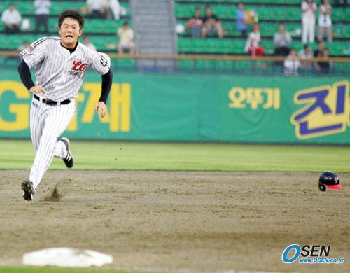 22일 기아 타이거즈와 LG 트윈스의 잠실경기 LG의 4회말 무사 1루서 박용택의 우측 2루타 때 1루 주자 이성렬이 헬멧이 벗겨진 채 3루를 향해 달리고 있다./잠실=주지영 기자 jj0jj0@osen.co.kr [Copyright ⓒ OSEN(www.osen.co.kr) 무단전재 및 재배포 금지]