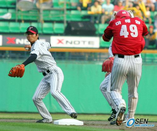 22일 기아 타이거즈와 LG 트윈스의 잠실경기 기아의 1회초 1사 1,2루서 임성민이 유격수 앞 땅볼을 치자 2루로 달리던 마해영이 LG 유격수 권용관의 송구에 행여 맞을까봐 두 손으로 머리를 감싸며 몸을 움츠리고 있다. 임성민까지 병살 처리됐다./잠실=주지영 기자 jj0jj0@osen.co.kr [Copyright ⓒ OSEN(www.osen.co.kr) 무단전재 및 재배포 금지]