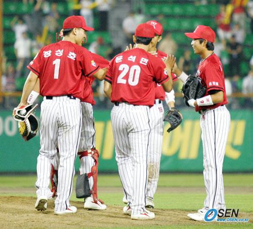 22일 기아 타이거즈와 LG 트윈스의 잠실경기서 5-3으로 이겨 탈꼴찌에 성공한 기아 선수단이 여느 때보다 더 기분좋게 하이파이브를 나누고 있다. LG가 반 게임차로 최하위로 내려 앉았다. /잠실=주지영 기자 jj0jj0@osen.co.kr [Copyright ⓒ OSEN(www.osen.co.kr) 무단전재 및 재배포 금지]