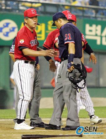 22일 기아 타이거즈와 LG 트윈스의 잠실경기 기아의 7회초 2사 1,2루서 김민철의 2루수쪽 내야 안타 때 볼이 1루로 송구되는 사이 홈까지 대시한 2루 주자 홍세완이 아웃된 뒤 백인호 코치의 어필이 받아들여지지 않자 유남호 감독이 나와 이민호 구심에게 설명을 요구하고 있다./잠실=주지영 기자 jj0jj0@osen.co.kr [Copyright ⓒ OSEN(www.osen.co.kr) 무단전재 및 재배포 금지]