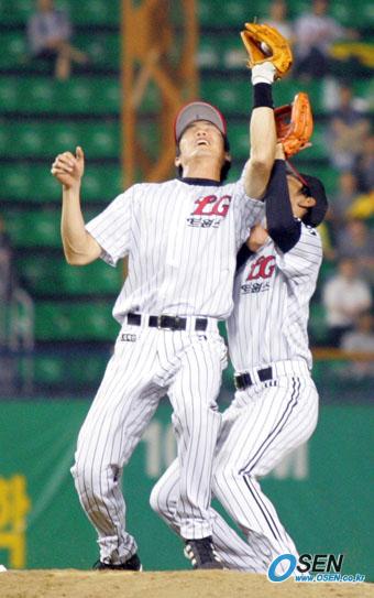 22일 기아 타이거즈와 LG 트윈스의 잠실경기 기아의 7회초 1사 1루서 마해영의 내야 높게 뜬 플라이를 LG 3루수 안재만이 받는 순간 유격수 권용관도 타구를 쫓다가 서로 부딪치고 있다./잠실=주지영 기자 jj0jj0@osen.co.kr [Copyright ⓒ OSEN(www.osen.co.kr) 무단전재 및 재배포 금지]