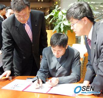 기아자동차가 축구 홍보대사로 유럽 무대에서 활약하는 국가대표 스타 이영표 설기현 박지성 차두리를 선정, 23일 오전 서울 양재동의 본사에서 자동차 증정식을 가졌다. 이영표가 계약서에 서명하고 있다. 본인들의 희망에 따라 박지성은 쏘렌토, 나머지 3명은 오피러스를 받았다./주지영 기자 jj0jj0@osen.co.kr [Copyright ⓒ OSEN(www.osen.co.kr) 무단전재 및 재배포 금지]