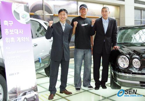 기아자동차가 축구 홍보대사로 유럽 무대에서 활약하는 국가대표 스타 이영표 설기현 박지성 차두리를 위촉, 23일 오전 서울 양재동의 본사에서 자동차 증정식을 가졌다. 본인들의 희망에 따라 박지성은 쏘렌토, 나머지 3명은 오피러스를 받았다. 이영표 설기현 차두리(왼쪽으로부터)가 '파이팅'을 외치고 있다. 박지성은 지난 22일 영국으로 출국, 불참했다./주지영 기자 jj0jj0@osen.co.kr [Copyright ⓒ OSEN(www.osen.co.kr) 무단전재 및 재배포 금지]