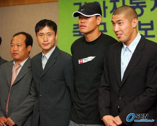 기아자동차가 축구 홍보대사로 유럽 무대에서 활약하는 국가대표 스타 이영표 설기현 박지성 차두리를 선정, 23일 오전 서울 양재동의 본사에서 자동차 증정식을 가졌다. 본인들의 희망에 따라 박지성은 쏘렌토, 나머지 3명은 오피러스를 받았다. 차두리 설기현 이영표(오른쪽으로부터)가 지난 22일 맨체스터 유나이티드 입단 신체검사를 위해 출국한 박지성의 아버지 박성종 씨(왼쪽끝)과 함께 기념 촬영하고 있다./주지영 기자 jj0jj0@osen.co.kr [Copyright ⓒ OSEN(www.osen.co.kr) 무단전재 및 재배포 금지]