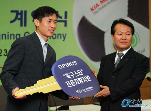 기아자동차가 축구 홍보대사로 유럽 무대에서 활약하는 국가대표 스타 이영표 설기현 박지성 차두리를 선정, 23일 오전 서울 양재동의 본사에서 자동차 증정식을 가졌다. 본인들의 희망에 따라 박지성은 쏘렌토, 나머지 3명은 오피러스를 받았다. 이영표가 열쇠 모형을 받아든 채 밝은 표정을 짓고 있다. /주지영 기자 jj0jj0@osen.co.kr [Copyright ⓒ OSEN(www.osen.co.kr) 무단전재 및 재배포 금지]