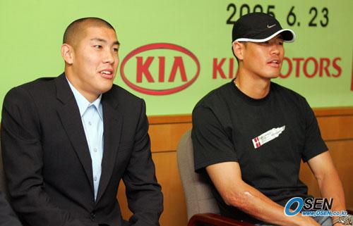 기아자동차가 축구 홍보대사로 유럽 무대에서 활약하는 국가대표 스타 이영표 설기현 박지성 차두리를 선정, 23일 오전 서울 양재동의 본사에서 자동차 증정식을 가졌다. 본인들의 희망에 따라 박지성은 쏘렌토, 나머지 3명은 오피러스를 받았다. 차두리(왼쪽)와 설기현이 행사가 진행되는 동안 나란히 앉아 있다./주지영 기자 jj0jj0@osen.co.kr [Copyright ⓒ OSEN(www.osen.co.kr) 무단전재 및 재배포 금지]