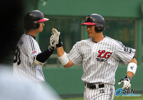 23일 LG 트윈스와 기아 타이거즈의 잠실경기 LG의 4회말 선두 타자 이종렬이 좌월 동점 홈런을 치고 홈인한 뒤 안재만과 하이파이브를 하고 있다./잠실=주지영 기자 jj0jj0@osen.co.kr [Copyright ⓒ OSEN(www.osen.co.kr) 무단전재 및 재배포 금지]