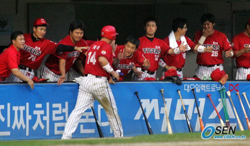 23일 LG 트윈스와 기아 타이거즈의 잠실경기 기아의 5회초 2사 3루 김상훈의 타구가 유격수 실책으로 처리되는 사이 심재학이 홈을 밟아 다시 리드를 잡은 기아 선수들이 심재학을 환영하고 있다./잠실=주지영 기자 jj0jj0@osen.co.kr [Copyright ⓒ OSEN(www.osen.co.kr) 무단전재 및 재배포 금지]