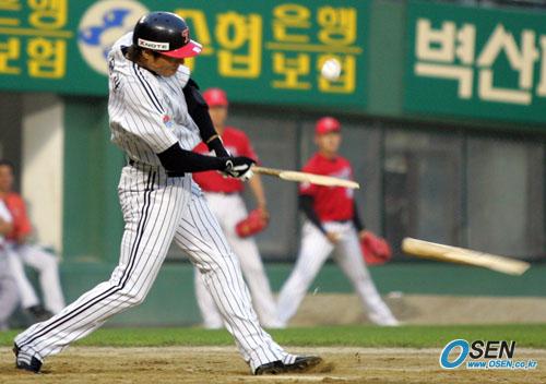 23일 LG 트윈스와 기아 타이거즈의 잠실경기 LG의 5회말 1사 1루서 권용관의 방망이가 기아 선발 투수 블랭크의 투구에 맞아 부러지고 있다./잠실=주지영 기자 jj0jj0@osen.co.kr [Copyright ⓒ OSEN(www.osen.co.kr) 무단전재 및 재배포 금지]