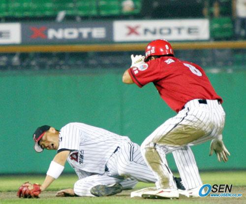 23일 LG 트윈스와 기아 타이거즈의 잠실경기 기아의 7회초 1사 1,2루서 김상훈의 유격수 땅볼 때 병살을 막으려던 1루 주자 최훈락의 발에 차인 LG 2루수 이종렬이 송구한 뒤 그라운드에 쓰러져 통증을 호소하고 있다. 병살 플레이는 성공했다./잠실=주지영 기자 jj0jj0@osen.co.kr [Copyright ⓒ OSEN(www.osen.co.kr) 무단전재 및 재배포 금지]