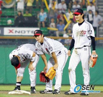 23일 LG 트윈스와 기아 타이거즈의 잠실경기 기아의 7회초 1사 1,2루서 김상훈의 유격수 땅볼 때 병살을 시도하던 LG 2루수 이종렬이 1루 주자 최훈락에 차인 뒤 유니폼 하의를 걷어 올려 정강이의 상처를 살펴보고 있다. 고참이 다치자 좌익수 정의윤(가운데)과 중견수 박용택이 달려와 함께 쳐다보고 있다./잠실=주지영 기자 jj0jj0@osen.co.kr [Copyright ⓒ OSEN(www.osen.co.kr) 무단전재 및 재배포 금지]