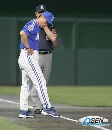24일 인천 문학 구장에서 벌어진 SK 와이번스와 삼성 라이온즈의 경기 삼성의 5회초 1사 1루서 박진만의 타구가 3루측 라인을 아슬아슬하게 벗어나 파울이 선언되자 유중일 3루 코치가 발로 라인을 가리키며 아쉬운 눈길로 쳐다보고 있다./인천=손용호 기자 spjj@osen.co.kr [Copyright ⓒ OSEN(www.osen.co.kr) 무단전재 및 재배포 금지]