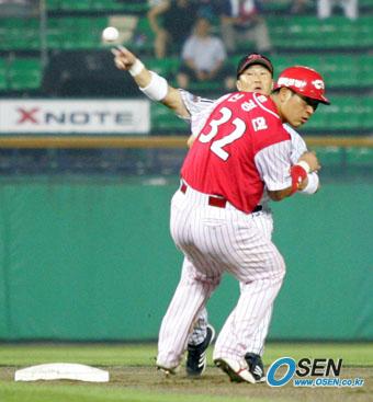 24일 LG 트윈스와 한화 이글스의 잠실경기 6회초 1사 1, 2루에서 백재호의 유격수 땅볼 때 LG 2루수 이종렬이 공을 받아 1루로 던져 더블플레이를 성공시키고 있다. /잠실=주지영 기자 jj0jj0@osen.co.kr [Copyright ⓒ OSEN(www.osen.co.kr) 무단전재 및 재배포 금지]