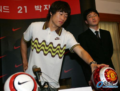 한국인 최초로 잉글랜드 프리미어리거가 된 박지성(맨체스터 유나이티드)이 25일 구단 신체검사를 마치고 귀국했다. 박지성이 인천공항에서 가진 공식 기자회견에서 맨체스터 유나이티드의 기념볼을 집어 들고 있다./인천공항= 주지영 기자 jj0jj0@osen.co.kr [Copyright ⓒ OSEN(www.osen.co.kr) 무단전재 및 재배포 금지]