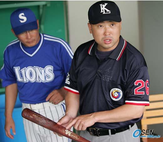 25일 SK 와이번스와 삼성 라이온즈의 인천 경기에 앞서 심판진이 불시에 배트 검사를 실시, 인증을 받은 방망이더라도 상표가 스티커로 돼 있는 것은 '모조품이 나올 수 있다'는 이유로 사용을 금지시켰다. 원현식 심판이 삼성 덕아웃에서 한대화 코치에게 이를 설명하고 있다. /인천=손용호 기자 spjj@osen.co.kr [Copyright ⓒ OSEN(www.osen.co.kr) 무단전재 및 재배포 금지]