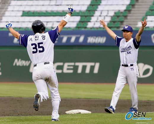 25일 인천 문학 구장에서 벌어진 SK 와이번스와 삼성 라이온즈의 경기 3회말 1사 만루서 삼성 선발 투수 임창용으로부터 우중월 만루 홈런을 빼앗은 뒤 두 팔을 치켜들며 쳐낸 SK의 이진영이 김동재 1루 주루코치와 함께 두 팔을 번쩍 들고 1루를 돌고 있다./인천=손용호 기자 spjj@osen.co.kr [Copyright ⓒ OSEN(www.osen.co.kr) 무단전재 및 재배포 금지]