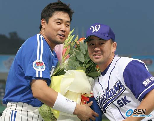 25일 인천 문학 구장에서 벌어진 SK 와이번스와 삼성 라이온즈의 경기 5회초 삼성의 양준혁이 SK 선발 투수 윤길현으로부터 좌익수 앞에 떨어지는 안타를 빼앗아 개인 통산 1772안타로 이 부문 최다 기록 보유자가 됐다. 이닝을 마친 뒤 홈 팀 SK의 주장 강성우(오른쪽)가 양준혁에게 꽃다발을 건네며 축하하는 흐뭇한 장면을 연출하고 있다./인천=손용호 기자 spjj@osen.co.kr [Copyright ⓒ OSEN(www.osen.co.kr) 무단전재 및 재배포 금지]