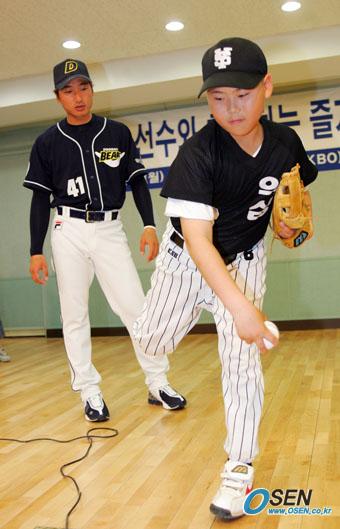 한국야구위원회(KBO)는 27일 오전 서울 역삼초등학교 강당에서 '학교 스포츠 보급 프로그램' 행사를 가졌다. 대한체육회가 주최하고 문화관광부와 교육인적자원부 등이 후원하는 이날 행사에는 LG 트윈스의 이병규 박용택과 두산 베어스의 홍성흔 정재훈이 참가, 자신들의 경험담을 들려 주고 간단한 실기 지도 등으로 야구 보급 활동을 펼쳤다. 정재훈이 야구부 어린이에게 투구 동작을 지도하고 있다./주지영 기자 jj0jj0@osen.co.kr [Copyright ⓒ OSEN(www.osen.co.kr) 무단전재 및 재배포 금지]