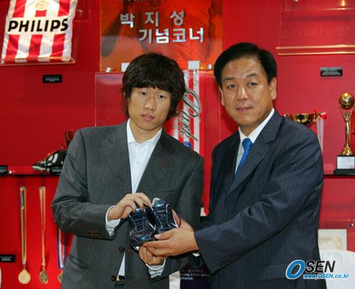 27일 오후 수원 월드컵경기장의 월드컵 기념관 내에 새로 마련된 박지성 코너 오픈 행사가 열렸다. 박지성이 지난 달 유럽챔피언스리그서 골을 넣을 때 신은 축구화를 박종희 수원 월드컵경기장 관리재단 사무총장(오른쪽)에게 기증하고 있다./수원=주지영 기자 jj0jj0@osen.co.kr [Copyright ⓒ OSEN(www.osen.co.kr) 무단전재 및 재배포 금지]