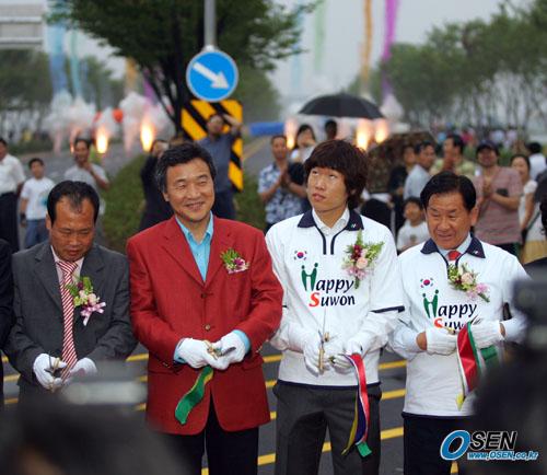 27일 오후 수원시 영통구 망포동 벽산e빌리지아파트 앞에서 열린 박지성로 개통식에서 테이프를 절단하는 순간 폭죽이 터지자 박지성이 깜짝 놀라며 소리가 난 쪽을 올려다 보고 있다./수원=주지영 기자 jj0jj0@osen.co.kr [Copyright ⓒ OSEN(www.osen.co.kr) 무단전재 및 재배포 금지]
