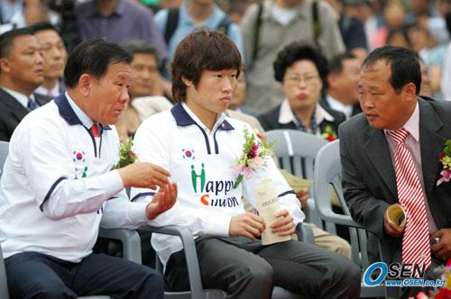 27일 오후 수원시 영통구 망포동 벽산e빌리지아파트 앞에서 열린 박지성로 개통식이 시작되기에 앞서 박지성 부자가 옆에 앉은 김용서 수원시장(왼쪽)과 이야기를 나누고 있다./수원=주지영 기자 jj0jj0@osen.co.kr [Copyright ⓒ OSEN(www.osen.co.kr) 무단전재 및 재배포 금지]