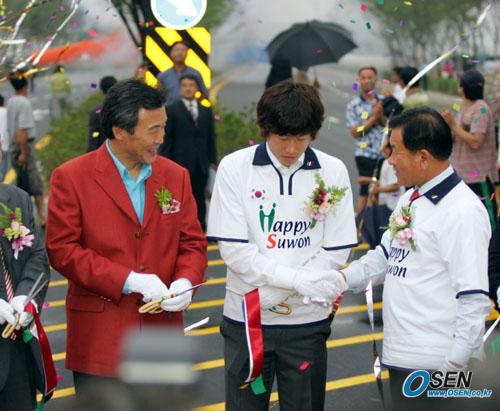 27일 오후 수원시 영통구 망포동 벽산e빌리지아파트 앞에서 열린 박지성로 개통식에서 기념 테이프를 절단한 박지성이 김용서 수원시장과 악수를 나누고 있다./수원=주지영 기자 jj0jj0@osen.co.kr [Copyright ⓒ OSEN(www.osen.co.kr) 무단전재 및 재배포 금지]