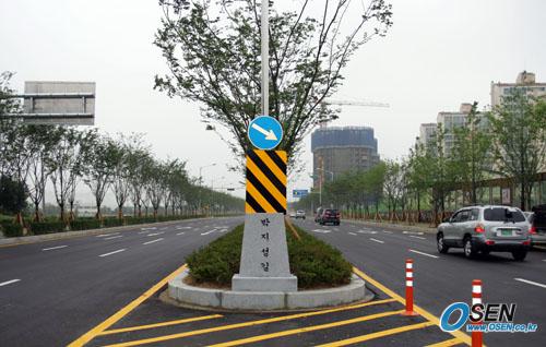 지난 27일 오후 개통된 수원시 영통구 망포동의 벽산e빌리지아파트 앞 도로 한복판에 박지성로를 알리는 비석이 세워져 있다./수원=주지영 기자 jj0jj0@osen.co.kr [Copyright ⓒ OSEN(www.osen.co.kr) 무단전재 및 재배포 금지]