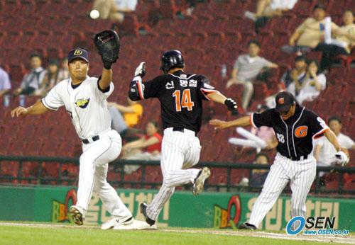 28일 잠실 구장에서 벌어진 두산 베어스와 롯데 자이언츠의 경기 6회초 롯데의 신명철이 내야땅볼을 친 뒤 1루로 들어가는 순간 공필성 롯데 1루 코치가 세이프라는 제스처를 취하고 있다. 이어 김병주 1루심이 아웃을 선언하자 신명철이 항의했지만 받아 들여지지 않았다./잠실=주지영 기자 jj0jj0@osen.co.kr [Copyright ⓒ OSEN(www.osen.co.kr) 무단전재 및 재배포 금지]