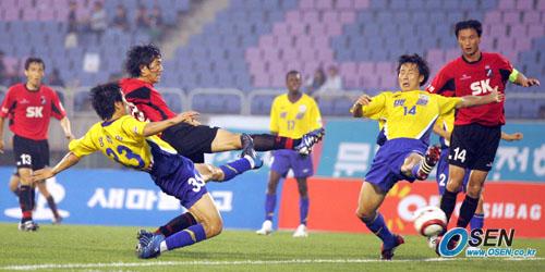 29일 부천 공설운동장서 벌어진 부천 SK와 성남 일화의 경기 전반 부천의 김재성(왼쪽에서 두 번째)이 성남 골에어리어 정면서 선제골을 터뜨리고 있다./부천=주지영 기자 jj0jj0@osen.co.kr [Copyright ⓒ OSEN(www.osen.co.kr) 무단전재 및 재배포 금지]