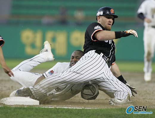 30일 잠실 구장에서 벌어진 두산 베어스와 롯데 자이언츠의 경기 롯데의 4회초 2사 2루서 중전 적시타를 친 펠로우가 볼이 홈으로 송구되는 사이 2루로 뛰려다 두산 선발 투수 스미스가 송구를 커트하자 황급히 귀루, 슬라이딩으로 세이프되고 있다. 스미스는 보기 드물게 투수이면서도 송구를 커트, 2루로 뛰던 펠로우를 잡으려다 펠로우가 비어 있는 1루로 돌아가는 바람에 직접 쫓아와 몸을 날려 태그를 시도했지만 무위였다./잠실=손용호 기자 spjj@osen.co.kr [Copyright ⓒ OSEN(www.osen.co.kr) 무단전재 및 재배포 금지]